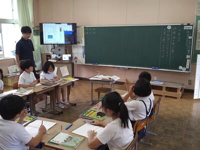 今日は、天草市教育委員会の先生、御所浦中学校の先生、東京からの学生さん(キャラバン隊)が来校されました。2時間目の5年生の国語の授業では、タブレット端末に自分の考えを残しながら、話し合いが行われました。児童は、緊張しながらも話し合いが少しずつ活発になっていく姿が見られました。緊張の中での授業、これも大切な経験です。