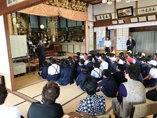 その後、担当の先生・校長先生・避難場所である東岸寺の貴田さんからお話をしていただきました。