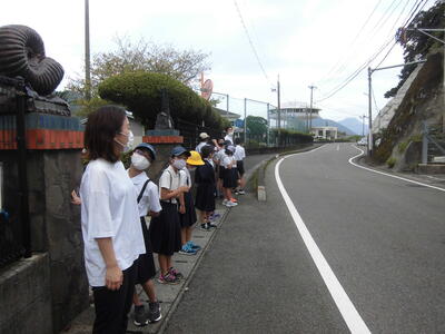 7月23日(水)、御所浦小中合同でボランティア活動を実施しました。中学校の生徒さん方がリードしながら、自分たちの地区で清掃活動に取り組みました。お菓子の袋やペットボトルなどのゴミを拾い、御所浦の環境をさらにきれいにしてくれた子どもたちです。ちなみに、写真の奥に見えるのは八代海です。遠くには九州山地も、うっすらと姿を見せていました。美しい景色と捨てられたゴミの対照が、なんとも印象的でした。