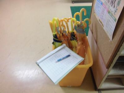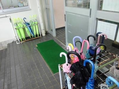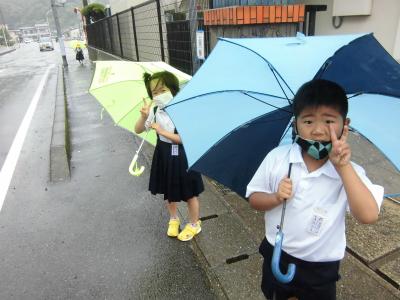 雨などまったく関係ないかのように、このごろ一緒にあいさつ運動をしてくれる1年生が傘を差してかけ足で来てくれました。