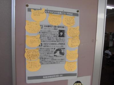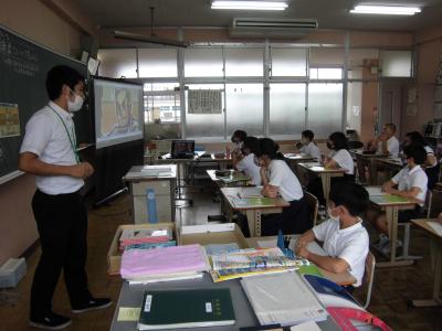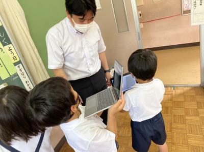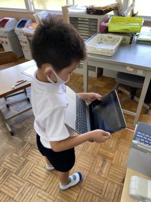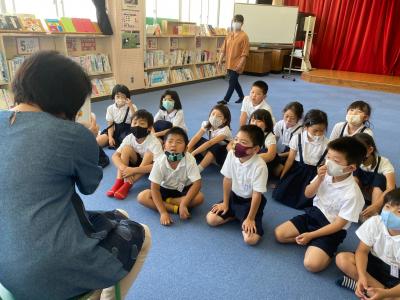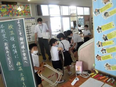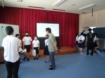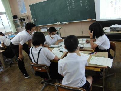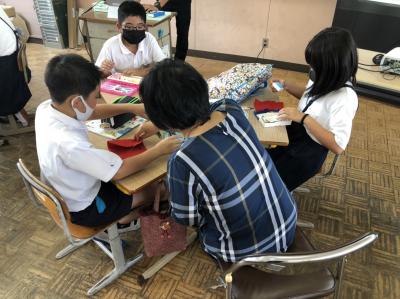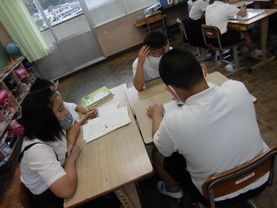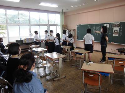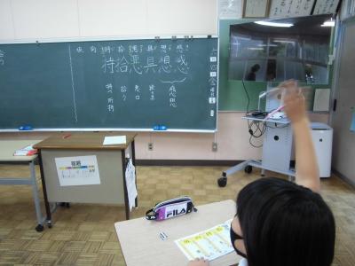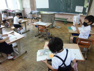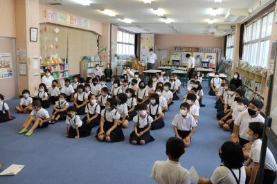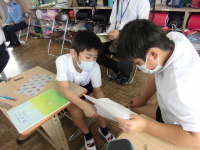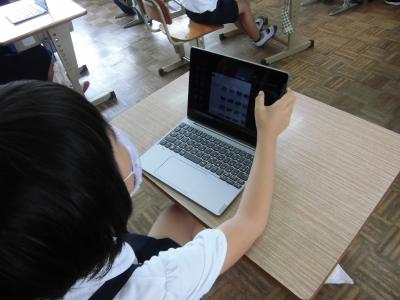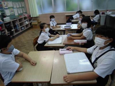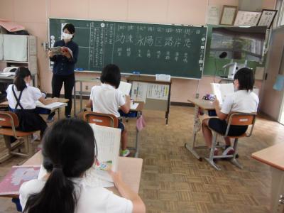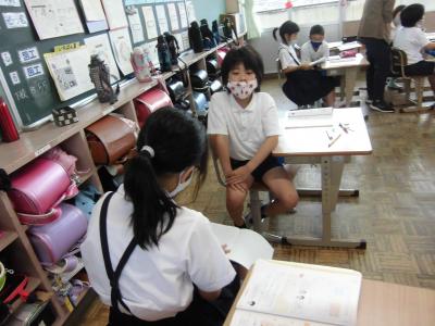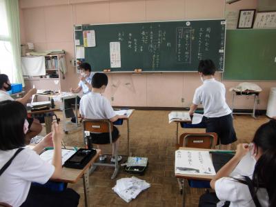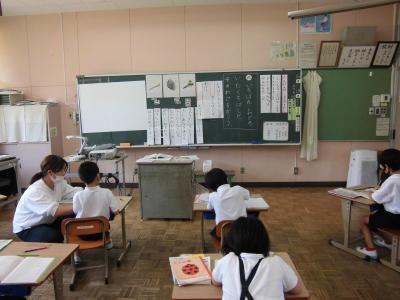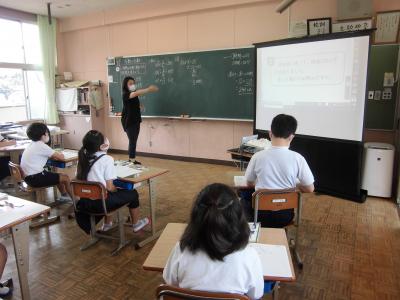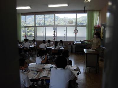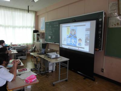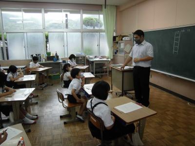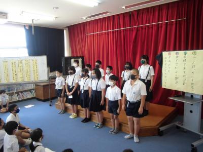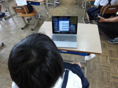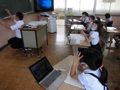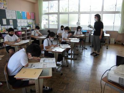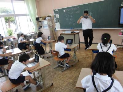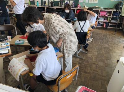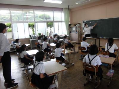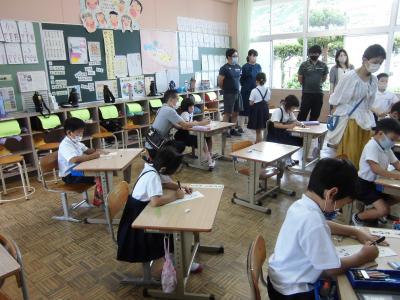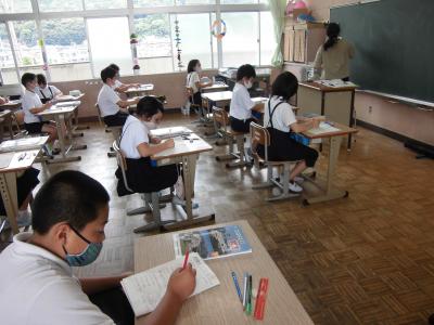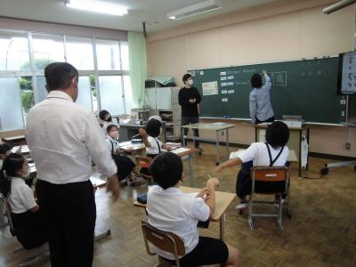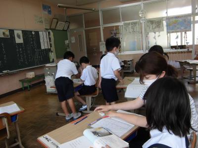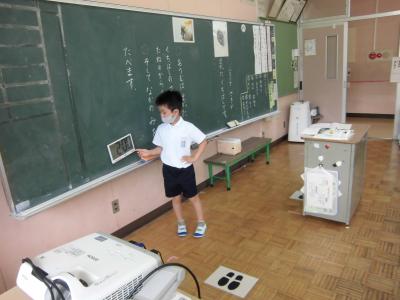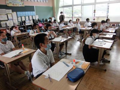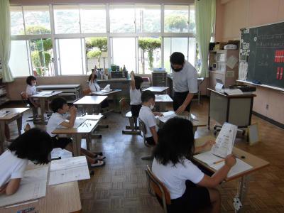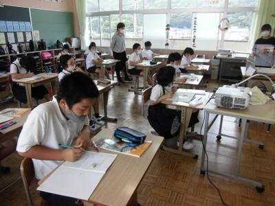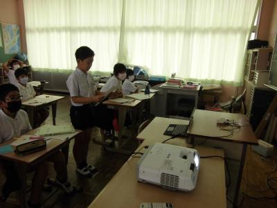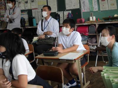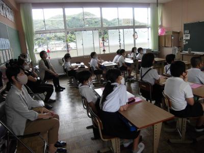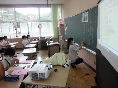 今日は、天草市教育委員会の先生、御所浦中学校の先生、東京からの学生さん(キャラバン隊)が来校されました。2時間目の5年生の国語の授業では、タブレット端末に自分の考えを残しながら、話し合いが行われました。児童は、緊張しながらも話し合いが少しずつ活発になっていく姿が見られました。緊張の中での授業、これも大切な経験です。