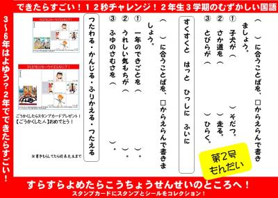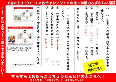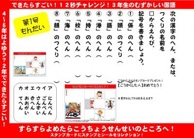 今日の児童集会では、体育委員会の発表と文化展の表彰が行われました。 体育委員会からは、各学年ごとの体力課題が提示され、それに応じたおすすめの運動が紹介されました。 限られた時間の中で練習を重ねた成果がよく伝わる、工夫された発表でした。 続いて、文化展の表彰がありました。毛筆や硬筆など、優秀賞に輝いた作品は全部で12点。 賞に選ばれなかった児童も、それぞれが心を込めて、自分だけのとっておきの作品を完成させていました。