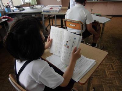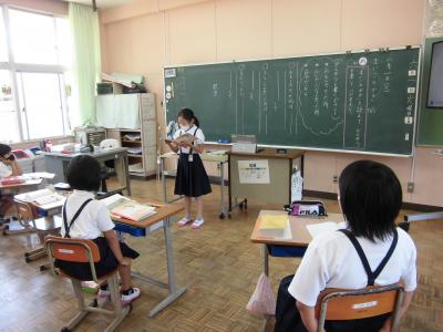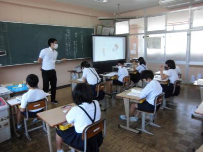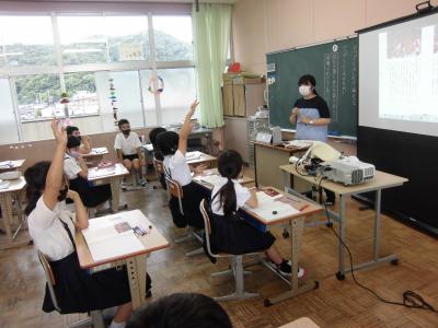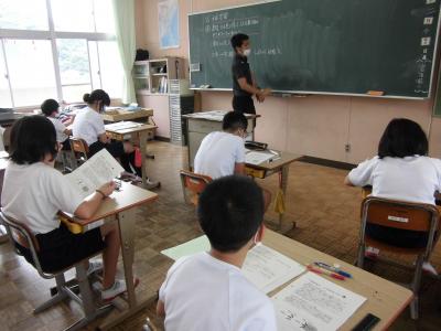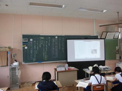 今日は、天草市教育委員会の先生、御所浦中学校の先生、東京からの学生さん(キャラバン隊)が来校されました。2時間目の5年生の国語の授業では、タブレット端末に自分の考えを残しながら、話し合いが行われました。児童は、緊張しながらも話し合いが少しずつ活発になっていく姿が見られました。緊張の中での授業、これも大切な経験です。