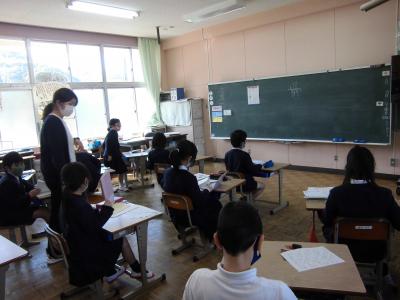 今日は、天草市教育委員会の先生、御所浦中学校の先生、東京からの学生さん(キャラバン隊)が来校されました。2時間目の5年生の国語の授業では、タブレット端末に自分の考えを残しながら、話し合いが行われました。児童は、緊張しながらも話し合いが少しずつ活発になっていく姿が見られました。緊張の中での授業、これも大切な経験です。