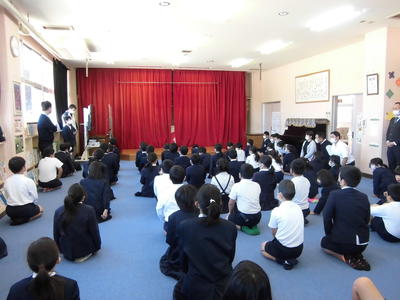 本日、東京都の明星大学の学生さん8名が、本校の教育活動の視察訪問に来校されました。皆さんは、へき地教育について自主的に学習をされている方々で、高い志を持たれています。歓迎会では、はつらつとした学生さんの姿に、子どもたちの目も輝いていました。3日間という短い期間ですが、御所浦小の子どもたちとの交流を満喫してほしいと思います。