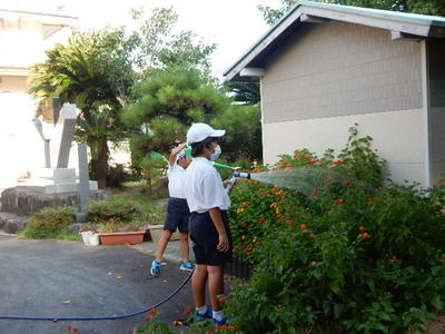 坂瀬先生の話「運動場の見える手洗い場で6年生が『校長先生が草を取っています』と言ってきました。『どうする?』と返すと、『手伝います』と答えたので、バスの出発時刻まで手伝うことになりました。」とのこと。