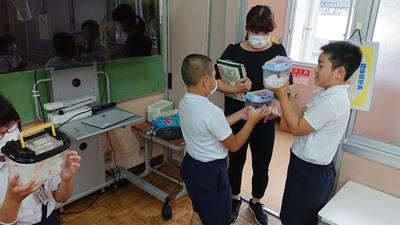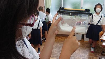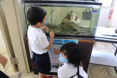 朝から子どもたちに囲まれる「ごしょっこ水族館」。今日も「わあ、きれいになってる!」と声をあげながら、1・2年生の子どもたちが水槽をのぞき込んでいました。昨日の放課後、保護者の方が掃除と海水の入れ替えをしてくださったおかげです。水槽の中では、鯛の稚魚がすくすくと成長しています。