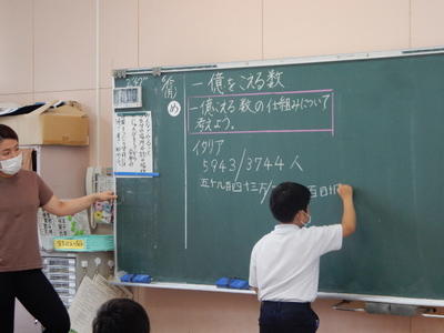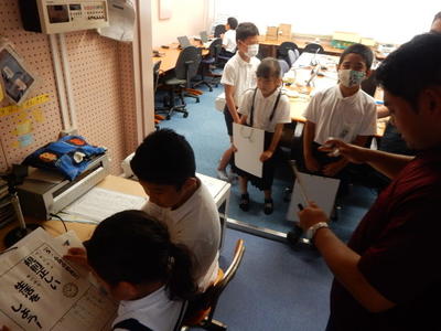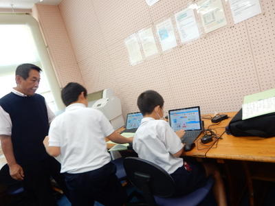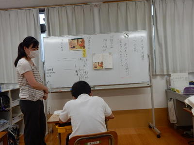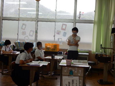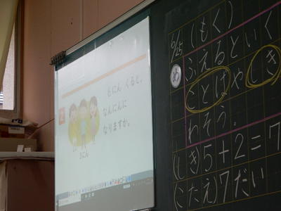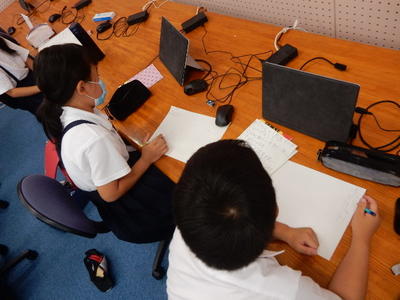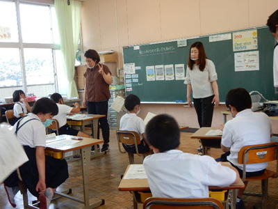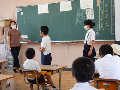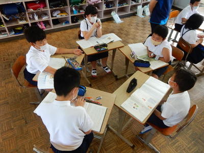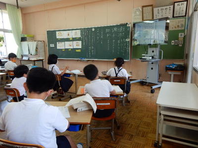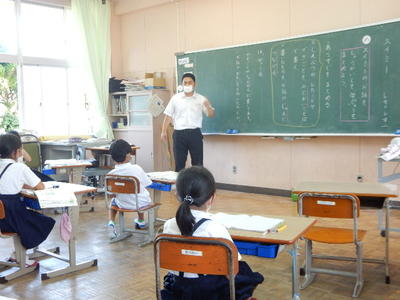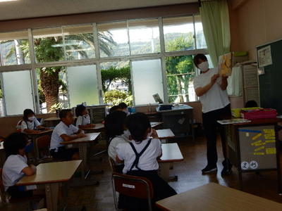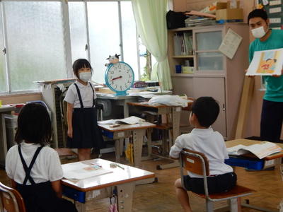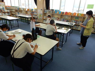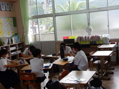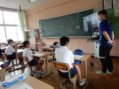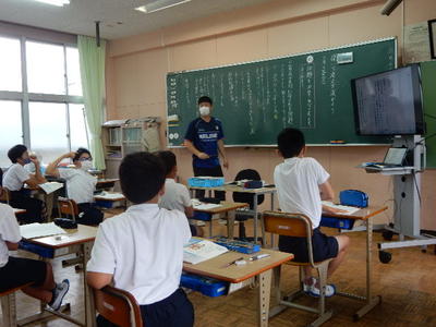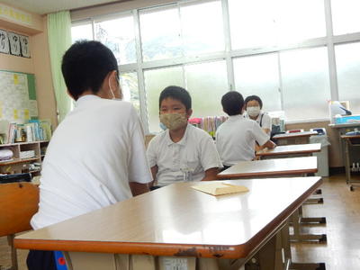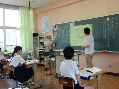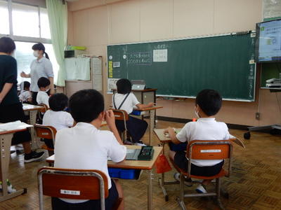 今日は、天草市教育委員会の先生、御所浦中学校の先生、東京からの学生さん(キャラバン隊)が来校されました。2時間目の5年生の国語の授業では、タブレット端末に自分の考えを残しながら、話し合いが行われました。児童は、緊張しながらも話し合いが少しずつ活発になっていく姿が見られました。緊張の中での授業、これも大切な経験です。