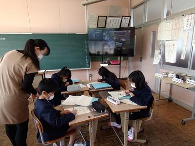 今日は、天草市教育委員会の先生、御所浦中学校の先生、東京からの学生さん(キャラバン隊)が来校されました。2時間目の5年生の国語の授業では、タブレット端末に自分の考えを残しながら、話し合いが行われました。児童は、緊張しながらも話し合いが少しずつ活発になっていく姿が見られました。緊張の中での授業、これも大切な経験です。