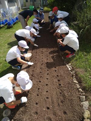 本日も低学年の「冬野菜を育てよう」の種植えの指導に「畑の先生」こと田中さん、荒木さん、長塚さんが来てくださいました。