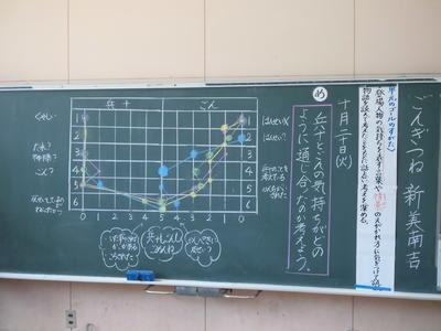 先日、3年生の竹﨑先生の、登場人物の気持ちに迫る心情数直線を紹介したところでしたが、4年生の中村先生は、「ごんと兵十の気持ちが近づいたかグラフ」を使っていました。