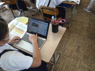 今日は、天草市教育委員会の先生、御所浦中学校の先生、東京からの学生さん(キャラバン隊)が来校されました。2時間目の5年生の国語の授業では、タブレット端末に自分の考えを残しながら、話し合いが行われました。児童は、緊張しながらも話し合いが少しずつ活発になっていく姿が見られました。緊張の中での授業、これも大切な経験です。