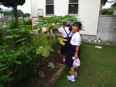 朝から、帽子をかぶってバケツとひしゃくをもっている児童が・・・。「どこ行くの?」と声をかけると、「水やりにいくんです!」とのこと。一緒について行くと、すくすくと育っているトウモロコシやミニトマトに水やりを始めました。「トウモロコシの赤ちゃんができているんですよ。」と、近くにいた1年生が嬉しそうに伝えてくれます。(その1年生は、数人並んでアサガオに水やりをしていたところでした。)・・・朝からすがすがしい気分になりました。
