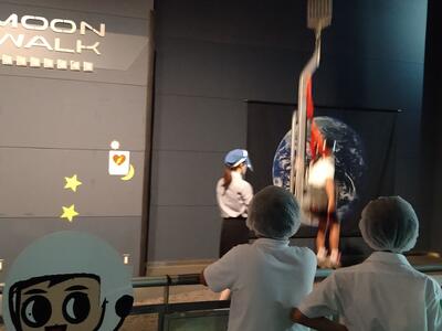 大人気の宇宙体験ゾーンです。ムーンウォークで月のお願いと重力を体験。ビヨ~ンビヨ~ンと上に引っ張られます。隣りではクルクル回って宇宙無重力体験です。