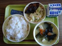 今日の給食です。ホッケのてりやく、大根サラダ、みそ汁、のりのつくだに、ごはん、牛乳。