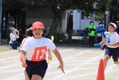 小学校赤白対抗リレーの様子です。