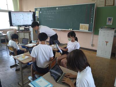 今日は、天草市教育委員会の先生、御所浦中学校の先生、東京からの学生さん(キャラバン隊)が来校されました。2時間目の5年生の国語の授業では、タブレット端末に自分の考えを残しながら、話し合いが行われました。児童は、緊張しながらも話し合いが少しずつ活発になっていく姿が見られました。緊張の中での授業、これも大切な経験です。