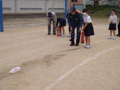 3年生・4年生の代表に水消化器を使って、消火実演を行ってくれました。