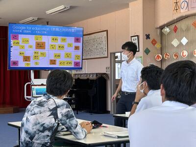 今日は、天草市教育委員会の先生、御所浦中学校の先生、東京からの学生さん(キャラバン隊)が来校されました。2時間目の5年生の国語の授業では、タブレット端末に自分の考えを残しながら、話し合いが行われました。児童は、緊張しながらも話し合いが少しずつ活発になっていく姿が見られました。緊張の中での授業、これも大切な経験です。