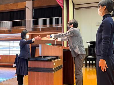 今日の児童集会では、体育委員会の発表と文化展の表彰が行われました。 体育委員会からは、各学年ごとの体力課題が提示され、それに応じたおすすめの運動が紹介されました。 限られた時間の中で練習を重ねた成果がよく伝わる、工夫された発表でした。 続いて、文化展の表彰がありました。毛筆や硬筆など、優秀賞に輝いた作品は全部で12点。 賞に選ばれなかった児童も、それぞれが心を込めて、自分だけのとっておきの作品を完成させていました。