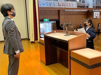 3時間目には、4年生が「天草市子ども民生委員 委嘱状交付式」に参加しました。多くの民生委員の皆様に見守られ、脇島会長から委嘱状を受け取った子どもたちは、民生委員としての活動をスタートさせました。その後、認知症サポーター養成講座を受けた4年生、気持ちが引き締まったことと思います。