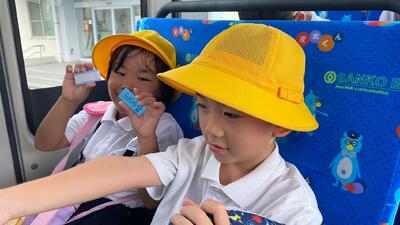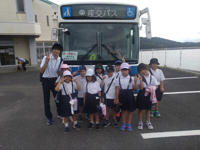 今日は1.2年生のバスの乗り方教室です。朝から子どもたちとても楽しみにしていました。このバスの乗り方教室は本校では天草市役所、産交バス様のご協力のもと3年前から実施しています。