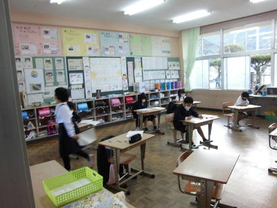 今日は、天草市教育委員会の先生、御所浦中学校の先生、東京からの学生さん(キャラバン隊)が来校されました。2時間目の5年生の国語の授業では、タブレット端末に自分の考えを残しながら、話し合いが行われました。児童は、緊張しながらも話し合いが少しずつ活発になっていく姿が見られました。緊張の中での授業、これも大切な経験です。