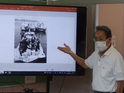 今みたいに船が岸壁に近寄れなかったので、櫓漕ぎの船で、沖に止まっている客船まで移動しはしごや手を引っ張ってもらい乗船していたこと。櫓漕ぎの船がポンポン船に代わって、海岸線の整備や埋め立てが行われ、今の様な船での移動が可能になったことなどたくさん学びました。子どもたちも船賃の値段の変化や生活の変化など質問をたくさんしていました。