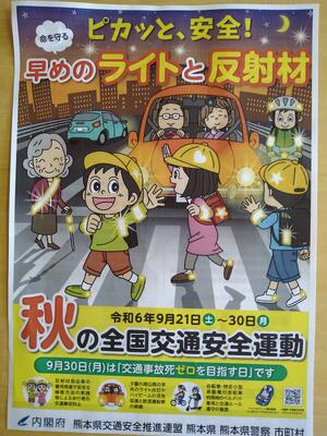 9月21日から秋の交通安全運動です。今年は「ぴかっと安全!早めのライトと反射板」が合言葉です。