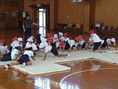今日の授業のようすから。1・2年生は合同体育です。マット運動。