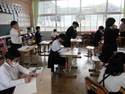 今日は、天草市教育委員会の先生、御所浦中学校の先生、東京からの学生さん(キャラバン隊)が来校されました。2時間目の5年生の国語の授業では、タブレット端末に自分の考えを残しながら、話し合いが行われました。児童は、緊張しながらも話し合いが少しずつ活発になっていく姿が見られました。緊張の中での授業、これも大切な経験です。