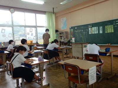 今日は、天草市教育委員会の先生、御所浦中学校の先生、東京からの学生さん(キャラバン隊)が来校されました。2時間目の5年生の国語の授業では、タブレット端末に自分の考えを残しながら、話し合いが行われました。児童は、緊張しながらも話し合いが少しずつ活発になっていく姿が見られました。緊張の中での授業、これも大切な経験です。