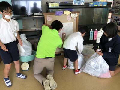 3年生は社会の時間。学校中のゴミの現状を調べます。校長室にも来てくれました。