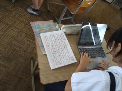 今日は、天草市教育委員会の先生、御所浦中学校の先生、東京からの学生さん(キャラバン隊)が来校されました。2時間目の5年生の国語の授業では、タブレット端末に自分の考えを残しながら、話し合いが行われました。児童は、緊張しながらも話し合いが少しずつ活発になっていく姿が見られました。緊張の中での授業、これも大切な経験です。