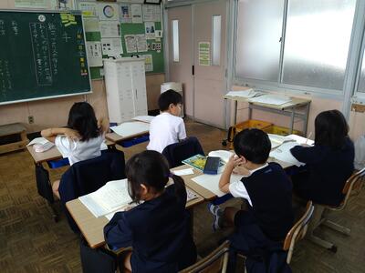 4年生は社会科です。天草市の旧市町の特産について調べています。市の資料では御所浦小町の特産は「夏みかん イワシ アジ」となっていました。ある子が「この資料は平成18年だからだいぶ変わってきてるかもしれない!」とつぶやいていました。そういう視点も大切ですね~。
