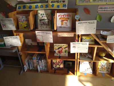 読書の秋ですね。図書室横には図書委員会の皆さんのお薦めの本が紹介文とともに展示してあります。本年度の目標は全員で7777冊。一人120冊ぐらい読むと到達します。
