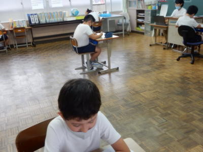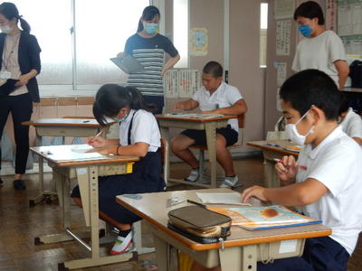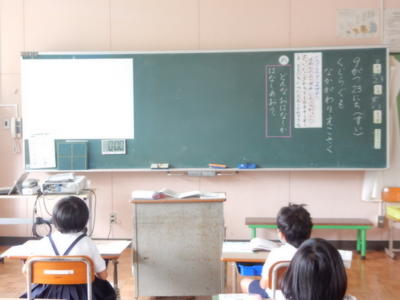 今日は、天草市教育委員会の先生、御所浦中学校の先生、東京からの学生さん(キャラバン隊)が来校されました。2時間目の5年生の国語の授業では、タブレット端末に自分の考えを残しながら、話し合いが行われました。児童は、緊張しながらも話し合いが少しずつ活発になっていく姿が見られました。緊張の中での授業、これも大切な経験です。