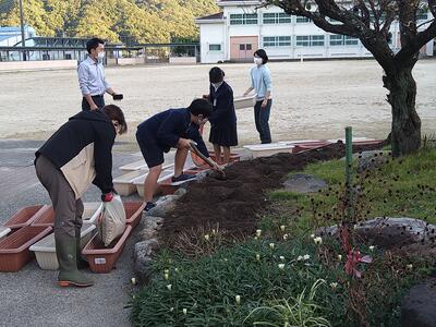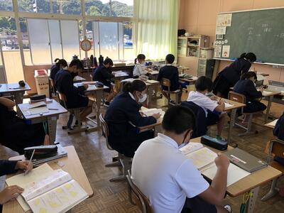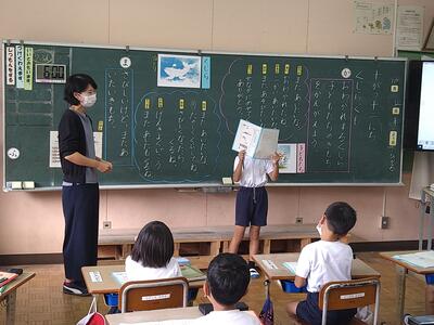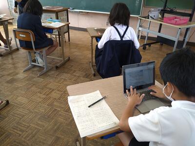 今日は、天草市教育委員会の先生、御所浦中学校の先生、東京からの学生さん(キャラバン隊)が来校されました。2時間目の5年生の国語の授業では、タブレット端末に自分の考えを残しながら、話し合いが行われました。児童は、緊張しながらも話し合いが少しずつ活発になっていく姿が見られました。緊張の中での授業、これも大切な経験です。