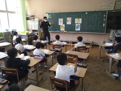 天草市では1年生から外国語に慣れ親しみます。3、4年生は外国語活動、5,6年生は外国語科として学習を進めています。