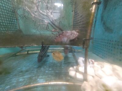 下の写真よーく見てください。卵がついています。マダコがたまごにずーっと水を拭きかけています。