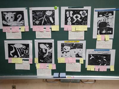 昨日戸締まりでまわっていると、4年生教室の黒板に版画の作品が飾ってありました。