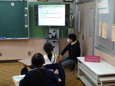 3年生は、分数について学習中です。1/3はなんで三分の一というのかを数直線を元に説明し合います。