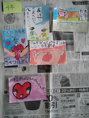 最後に昨日の午後は、「障害のある人もない人もともに暮らす」をテーマに4~6年生が絵手紙を書きました。紹介します。