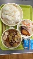 今日の給食はご飯、牛乳、チャプチェ、照り焼きハンバーグでした。おいしくいただきました。ちなみにチャプチェとは朝鮮半島の料理だそうです。