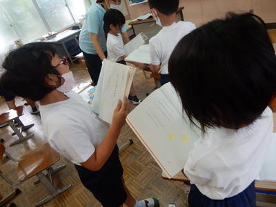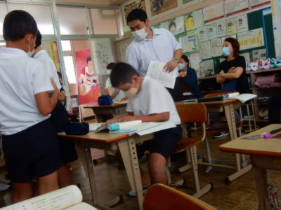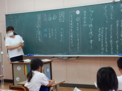 今日は、天草市教育委員会の先生、御所浦中学校の先生、東京からの学生さん(キャラバン隊)が来校されました。2時間目の5年生の国語の授業では、タブレット端末に自分の考えを残しながら、話し合いが行われました。児童は、緊張しながらも話し合いが少しずつ活発になっていく姿が見られました。緊張の中での授業、これも大切な経験です。