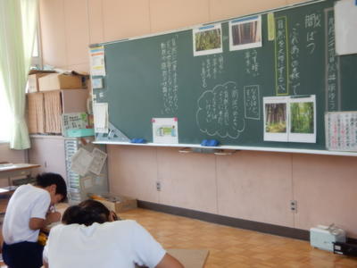 3年生が詩の学習をしていました。前の教科書にはなかった展開で、有名な金子みすゞさんの「私と小鳥とすずと」と有名な阪田寛夫さんの「夕日がせなかをおしてくる」を比べながら読むという学習です。