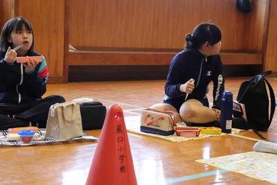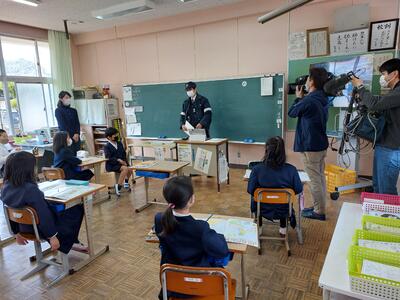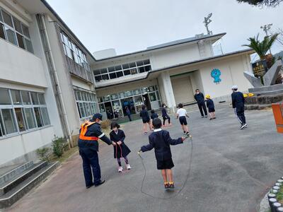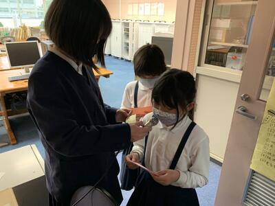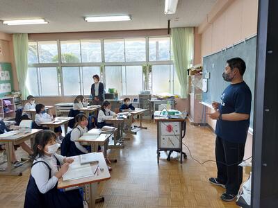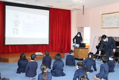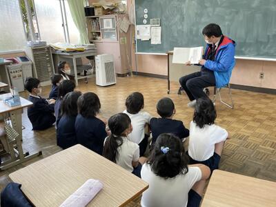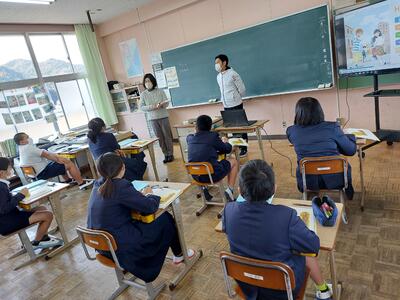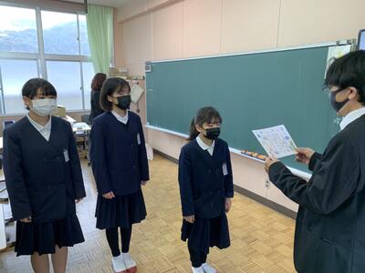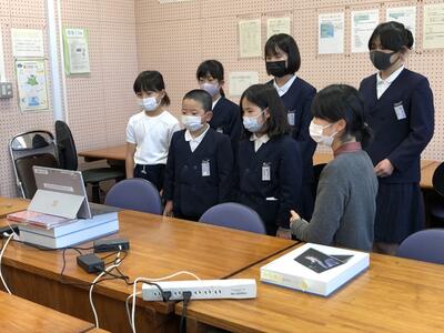2年生教室から戻ると、先日、6年生がイルミネーションの取組を発表する企画を主催していただいた天草市教育委員会生涯学習課から、向様、小林様に来ていただきました。6年生のがんばりを評価していただくとともに、ねぎらいのプレゼントを届けていただきました。本当にありがとうございました。