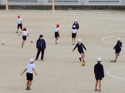 運動場には体育のハードル走の学習のためにラインを引く田嶌先生と5年生の姿がありました。