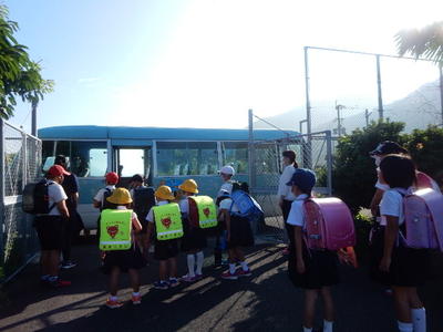 今日はスクールボート、スクールバス、正門前交差点の順で登校を見守りました。