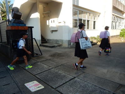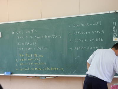 次に、夏休みに注意点いてほしいことを4つ言います。①手洗い、うがい、マスクを着けるなどの予防についてです。新型コロナウイルスがまだ増え続けています。3つの密を避けて予防をお願いします。②公共施設の使い方です。公共施設とは、子どもたち、大人の方々、だれもが使える場所、しおさい館、御所浦図書館などです。夏休みは観光客の人たちも増えます。自分1人で使うのではなく、周りの人のことも考えた使い方をしましょう。御所浦小児童として恥ずかしくないかっこいい行動を期待しています。③交通ルールを守って生活することです。自転車は3年生以上の人、2年生以下の人で乗れる場所が決まっています。ヘルメットをかぶる、自転車は一列で左側走行、横断歩道を安全に渡ることに気をつけましょう。御所浦に帰ってくる方で車が多くなります。安全に気をつけましょう。④スマホ、タブレット、ゲームの使い方です。以前、家庭のルールを決めて書いたと思います。貼っていますか?SNSの被害が増えています。決めただけでなく、もう一度確認してきちんと守りましょう。